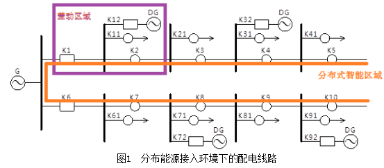 圖1是分布能源接入環境下的配電線路的典型結構圖。引入區域差動保護技術之后,保護定值針對一個區域,根據基爾霍夫電流定律,針對一個區域ΣI=0,理論上,任何環境下的區域保護定值都是0。實際的保護定值應該是大于0的某一個值Id。這個Id和區域無關,只和ΣI中各個分量采樣和計算誤差有關。亦即,常規型FA技術中,保護定值調整困難和無法設置的問題在區域差動保護技術完全不存在了。