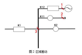 考慮圖2中的典型差動區域,可能故障點有三處。位置1發生故障時,K12速斷跳開,完成故障隔離。位置2發生故障時,k12過流但方向閉鎖不跳,k11過流速斷跳開,完成故障隔離。